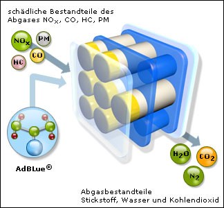 Chemisch ist AdBlue eine hochreine Harnstofflösung. Die Ausgangsstoffe sind von höchster Reinheit und die hohen Qualitätsansprüche werden mit der DIN 70070 gesichert. AdBlue wurde speziell für die die SCR-Technolgie dieselbetriebener LKW mit Abgasnorm Euro 4/5 entwickelt.