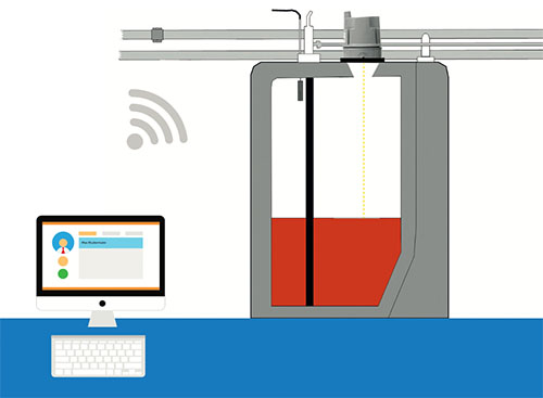 dem oberen Rand des Speichertanks und der Oberfläche der Flüssigkeit in Ihrem Öltank zu messen. Wenn sich die Menge an Öl im Tank verringert, wird der gemessene Abstand dementsprechend größer. Die Abstandsinformation oder der Füllstand bis zur Tankdecke („Ullage“) wird per GSM übertragen.