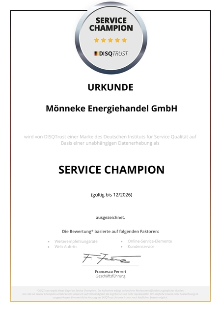 Mit dem Service Champion-Siegel unterstreicht Mönneke Energiehandel seine Rolle als vertrauensvoller Energiedienstleister, der klassische Werte wie Verlässlichkeit mit modernen Service-Standards verbindet.